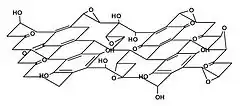 - Ресс предложил другой вариант с использованием гидроксильных групп. Базальная плоскость превратилась из sp2- в sp3-гибридизованную систему. Эта формула была создана как аналог таковой в полимере карбон монофторида.