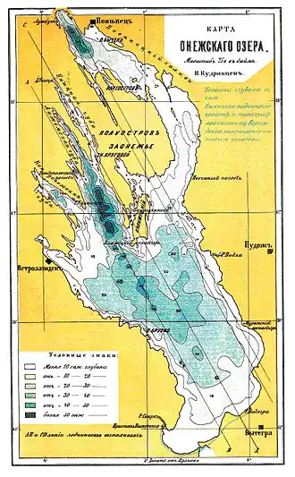 В 1874—1894 годах состоялась гидрографическая экспедиция «Отдельная съёмка Онежского озера», организованная Морским министерством Российской империи с целью проведения топографической съёмки прибрежной полосы, промера глубин, изучения донных отложений, течений, термического и уровенного режимов Онежского озера. В результате исследований была составлена генеральная карта озера «Руководство для плавания в Онежском озере». Навигационные карты впервые были изданы в 1906 году и в дальнейшем неоднократно уточнялись и перепечатывались[12].