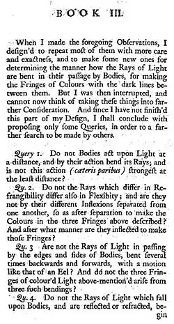 В третьей книге рассматриваются дифракция (которую Ньютон называет «изгибаниями», англ. inflexions) и поляризация света. Книга завершается «Вопросами» «для дальнейшего исследования, которое произведут другие». Эти вопросы касаются разнообразных тем, некоторые из которых не имеют отношения к оптике[16].