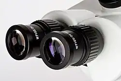 Окуля́р — обращённая к глазу часть микроскопа, предназначаемая для рассматривания с некоторым увеличением оптического изображения, даваемого объективом микроскопа. Типовые увеличения окуляров для микроскопов от 5 до 25 единиц. Так же как и объективы, окуляры различаются по качеству, то есть величине оптических искажений, вносимых окуляром. Однако вклад искажений объектива обычно превалирует в сбалансированном микроскопе благодаря тому, что искажения объектива дополнительно увеличиваются окуляром, а искажения самого окуляра — нет. Поэтому окуляры обычно характеризуются другими параметрами, в первую очередь удобством оператора. Как правило, под этим удобством понимают ширину поля зрения и вынос зрачка.