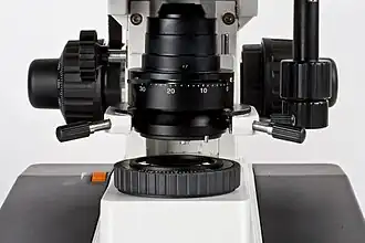 В современном микроскопе практически всегда есть осветительная система (в частности, конденсор с ирисовой диафрагмой), макро- и микровинты для настройки резкости, система управления положением конденсора.