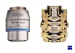 Объектив микроскопа представляет собой сложную оптическую систему, образующую увеличенное изображение объекта, и является основной и наиболее ответственной частью микроскопа. Объектив создаёт изображение, которое рассматривается через окуляр. Поскольку окуляры могут давать существенное увеличение, то и оптические искажения, вносимые объективом, также будут увеличены окуляром. Это накладывает на качество объектива значительно большие требования, чем на окуляр.