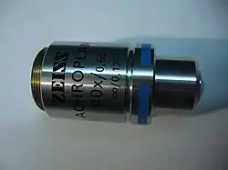 - Через дробь от увеличения указывается числовая апертура — характеристика разрешающей способности объектива. Предельная разрешающая способность объектива в мкм , где λ — длина волны света, мкм; А — числовая апертура. Лучшие объективы имеют апертуру 1,4 и разрешение 0,12 мкм. Оценочно считают что максимальное разумное увеличение микроскопа при наблюдении глазом ограничено величиной апертуры умноженной на 1000. С другой стороны, чем больше апертура тем меньше глубина резкости (глубина зрения)[9]. Иногда объектив снабжается регулируемой диафрагмой, изменяющей числовую апертуру (такие объективы маркируются I, Iris).