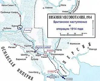 1 ноября 1914 года был обнародован фирман Ирана о нейтралитете[23]. В ноябре 1914 года для защиты нефтяных месторождений от Османской империи Великобритания вторглась в Ирак. Турки наступали из Месопотамии и из гор турецкого Курдистана под командованием германских военных советников.