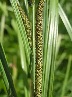 Соцветие 10—25(30) см длиной; верхние 2—3(4[6]) колоска тычиночные, сближенные, продолговатые, 2—6 см длиной[6], с обратнояйцевидными, тупыми, тёмно-бурыми чешуями; остальные 3—4(5) — пестичные, обычно многоцветковые, рыхловатые, узкоцилиндрические, (2,5)3—7(10[6]) см длиной, 0,6—0,8 см шириной[6], почти сидячие или нижние иногда на ножках до 2 см длиной, поникшие. Кроющие чешуи пестичных колосков большей частью ланцетные, обычно длиннее мешочка в 1,5 раза, реже немного длиннее или равные ему, очень редко короче его, всегда у́же мешочка, с одной жилкой, чёрно-бурые, с белым килем. Мешочки двояковыпуклые, немного вздутые, эллиптические или обратнояйцевидные, 3 мм длиной[6], ржавые или буроватые, тонкокожистые, с обеих сторон с 5—6 тонкими жилками, у основания быстро суженные в короткую ножку, с коротким цельным, реже слабовыемчатым носиком; носик на верхушке с бурым окаймлением. Рылец 2. Нижний кроющий лист без влагалища, линейный, реже щетиновидный, превышает соцветие.