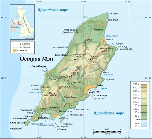 Расположен в Ирландском море примерно на одинаковом расстоянии от Англии, Ирландии, Шотландии и Уэльса. Он имеет один из старейших парламентов в мире (Тинвальд), существующий с 979 года. Столица — город Дуглас (мэн. Doolish).