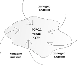 Для большинства городов разница в температуре между городской и окружающей сельской местностью наибольшая в ночное время. Типичная разница температур составляет несколько градусов между центром города и окружающими пригородами[7][8]. Разница в температуре между внутренним городом и его окрестностями часто упоминается в сводках погоды, например, 20 °C в центре города, 18 °C в пригородах". «Среднегодовая температура воздуха в городе с населением 1 миллион человек и более может быть на 1,0-3,0 °C теплее, чем в его окрестностях. Вечером разница может достигать 12 °C»[9][10].