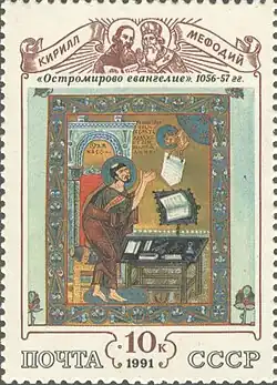 Почтовая марка СССР, 1991. Серия Культура русского средневековья XI—XVI века: «„Остромирово Евангелие“. 1056—57 гг.», оформление Герман Комлев