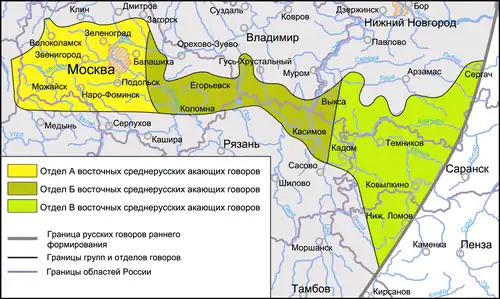 Говоры отдела А распространены в юго-западной и центральной частях Московской области, а также на небольшой части севера Калужской области. На севере говоры отдела А граничат с говорами Владимирско-Поволжской группы, включая Тверскую подгруппу, на западе с Селигеро-Торжковскими говорами западных среднерусских говоров и Верхне-Днепровской группой говоров южного наречия, на юге с Тульской группой южного наречия и на востоке с говорами отдела Б восточных среднерусских акающих говоров[1].