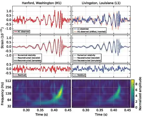 −0,4 мс на H1; для визуального сравнения данные с H1 показаны на графике L1 в обращённом и сдвинутом по времени виде (чтобы учесть относительную ориентацию детекторов). Второй ряд: напряжения h от гравитационно-волнового сигнала, пропущенные через такой же полосный фильтр 35—350 Гц. Сплошная линия — результат численной относительности для системы с параметрами, совместимыми с найденными на базе изучения сигнала GW150914, полученный двумя независимыми кодами с результирующим совпадением 99,9. Серые толстые линии — области 90 % доверительной вероятности формы сигнала, восстановленные из данных детекторов двумя различными методами. Тёмно-серая линия моделирует ожидаемые сигналы от слияния чёрных дыр, светло-серая не использует астрофизических моделей, а представляет сигнал линейной комбинацией синусоидально-гауссовых вэйвлетов. Реконструкции перекрываются на 94 %. Третий ряд: Остаточные ошибки после извлечения отфильтрованного предсказания сигнала численной относительности из отфильтрованного сигнала детекторов. Нижний ряд: представление частотной карты напряжений, показывающее возрастание доминирующей частоты сигнала со временем.