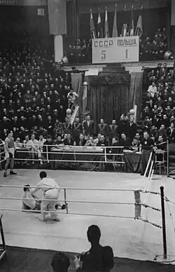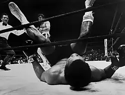 - Один из спортсменов касается поверхности ринга третьей точкой;