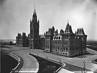 В феврале 1916 года внешний вид города снова был изменён пожаром: 3 февраля загорелось центральное здание парламента. Центральная башня Виктории погибла в огне, её колокол, согласно легенде, рухнул на землю с 11-м ударом часов, бивших полночь[17]. Не пострадали лишь северо-западное крыло главного здания и парламентская библиотека, в необычный архитектурный проект которой изначально была заложена идея максимальной безопасности книг и архивов[18]. После пожара заседания парламента были перенесены в Мемориальный музей Виктории. Несмотря на то, что Канада участвовала в это время в мировой войне, уже 1 сентября 1916 года краеугольный камень парламентского здания, уцелевший при пожаре, был заново заложен генерал-губернатором Канады герцогом Коннаутским. Изначально планировалось, что новый парламент будет построен за год, но из-за войны строительство затянулось. Первое заседание парламента в новом здании прошло в феврале 1920 года, но строительство новой главной башни — башни Мира (англ. Peace Tower) — продолжалось ещё много лет[19].