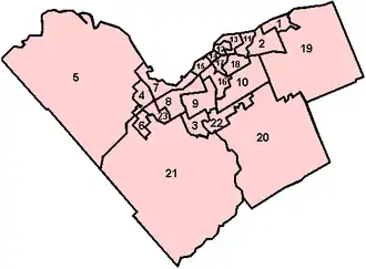 Оттава, представляющая собой единую переписную область, административно разделена на 23 избирательных округа. Помимо этого, город административно разделён на почтовые регионы и полицейские округа.