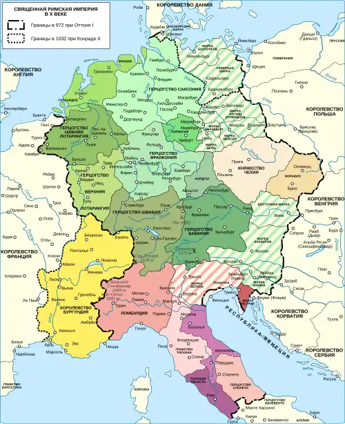 В 961 году Оттон I Великий завоевал Итальянское королевство. Покровительство Оттона и его непосредственных преемников способствовало так называемому «оттоновскому возрождению» искусства и архитектуры. Следуя примеру коронации Карла Великого как «императора римлян» в 800 году, Оттон был коронован императором Священной Римской Империи в 962 году папой Иоанном XII в Риме.