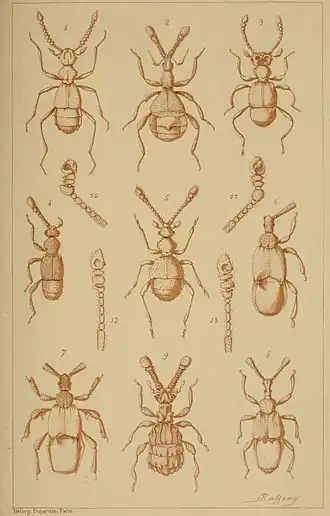 - ↑ Parker J (2016) Myrmecophily in beetles (Coleoptera): Evolutionary patterns and biological mechanisms. Myrmecological News 22: 65-108.