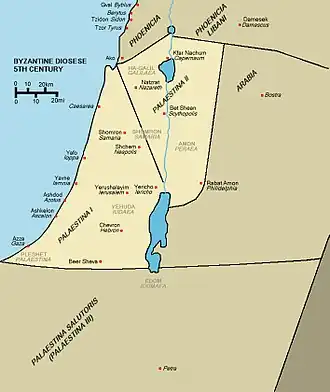 В эпоху домината в ходе административных реформ императора Диоклетиана (284—305) провинция Палестина и ряд прилегающих территорий были разделены на провинции Палестина I, II и III. В Палестину Первую с центром в Кесарии была включена центральная часть территории страны с Иерусалимом, Иерихоном и Газой. Палестина Вторая с центром в Скифополе (ныне Бейт-Шеан) была сформирована из северных районов страны: Галилеи, части Самарии, Заиорданья, Иорданской и Изреельской долин[3]. В Палестину Третью с центром в Петре вошли южные часть Иудейской пустыни и пространства между Мёртвым морем и заливом Акаба, населенные кочевниками[2]. Провинции Палестина I, II и III вошли в Диоцез Восток, относившийся с конца III века к Восточной Римской империи, ставшей позднее Византией[1]. Была создана митрополия Скифополя Иерусалимского патриархата[2].