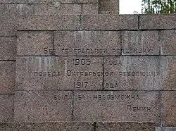 На высоком пьедестале высечена надпись «Памяти жертв 9-го января 1905 года». На гранитном основании две надписи: «Тысячи убитых и раненых — таковы итоги кровавого воскресенья 9-го января в Петербурге. Немедленное низвержение правительства — вот лозунг, которым ответили на бойню 9-го января… петербургские рабочие. Ленин» и «Без генеральной репетиции 1905 года победа Октябрьской революции 1917 года была бы невозможна. Ленин»[2].