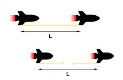 Это можно проиллюстрировать следующим образом. Смещение кораблей относительно своих исходных позиций — вдоль оси СО — как функция времени может быть записана в виде . Эта функция, вообще говоря, зависит от функции тяги двигателей, но важно, что она одинакова для обоих космических кораблей. Поэтому положение каждого корабля как функция времени будет: