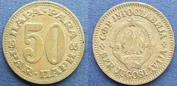Восстановление единой денежной системы началось с выпуска в 1944 году в освобождённых районах новых банкнот в динарах и завершилось после окончания Народно-освободительной войны и проведения в 1945 году денежной реформы. В ходе реформы в обращение была выпущена цинковая монета в 50 пара. В 1953 году была выпущена алюминиевая монета того же номинала[10].