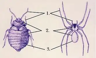 Основные особенности паукообразных (слева постельный клоп; справа коричневый паук отшельник) : конечности (1), сегментированное тело (2), покров (3)