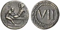 Мальчик-проститутка делает минет. Изображение на «спинтрии» — жетоне публичного дома. I—II вв. н. э.
