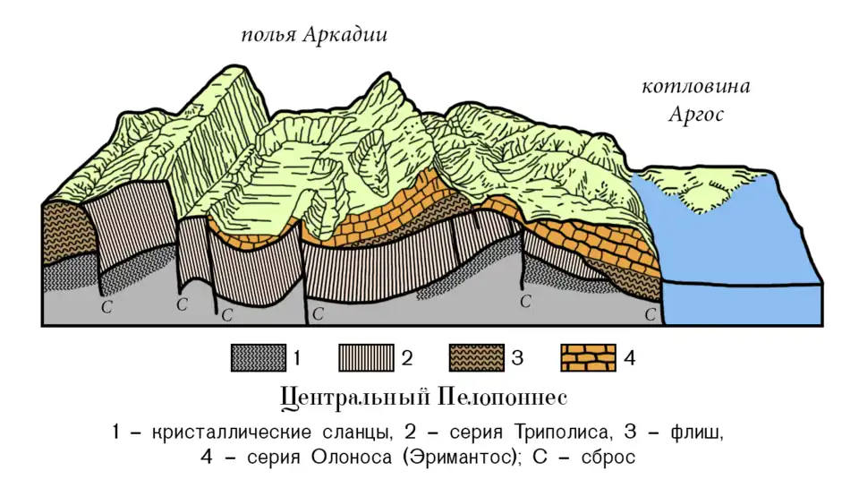 Области опускания расчленили полуостров на отдельные горсты, похожие по расположению на пальцы рук. Котловины Мессинии Мегалополиса и Спарты, внутренние котловины Аркадии, Коринфский и Арголидский заливы - результаты сбросовых движений. Залегающие обломочные отложения встречаются в каждой котловине. К юго-западу от горста Мессинии на расстоянии в 3 км морское дно опускается на глубину до 2600 метров. Это свидетельствует о типичном сбросовом побережье[298].