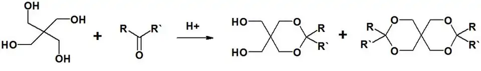 Также пентаэритрит может реагировать с альдегидами и кетонами в кислой среде с образованием моно- и бициклического продукта: