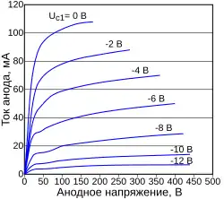 Анодные вольт-амперные характеристики (ВАХ) маломощных пентодов близки к идеальным: резкий переход из режима возврата в режим перехвата происходит при относительно низких плоские «полки» ВАХ свидетельствуют о высоком выходном сопротивлении (6Ж32П — 2,5 МОм в номинальном режиме [75]). Это позволяет строить на пентодах почти совершенные дифференциальные каскады[76] и активные нагрузки (стабильные источники тока)[77]. В мощных пентодах выходное сопротивление относительно низкое, а переход в зону перехвата растянут. При малых анодных напряжениях и большом отрицательном смещении управляющей сетки наблюдается «тетродная» нелинейность полки ВАХ.