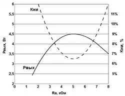 Из-за нелинейности характеристик и высокого выходного сопротивления мощные экранированные лампы чувствительны к выбору сопротивления нагрузки. Оптимальное сопротивление нагрузки, при котором коэффициент нелинейных искажений достигает минимума, должно лежать в диапазоне от 1/10 до 1/8 внутреннего сопротивления пентода[49]. Как правило, тот же уровень соответствует максимальной выходной мощности. При неоптимальном выборе нагрузки максимальная выходная мощность резко падает, а искажения на этой мощности — растут. На малых выходных мощностях также весьма высок: для EL34 в оптимальном однотактном включении он достигает 2 % уже при = 1 Вт, и далее растёт почти линейно до 10 % при = 8 Вт[89]. В однотактном триодном включении та же EL34 имеет Kни=8 % при Рвых. макс=6 Вт[90]. В двухтактном включении происходит взаимное вычитание чётных гармоник двух плеч схемы, поэтому максимальный падает до 5 % [91], — но при этом почти все эти 5 % представляют собой неблагозвучные нечётные гармоники.