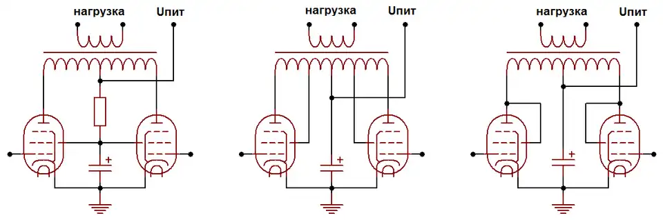 | Маломощный пентод (6Ж32П) | Мощный пентод НЧ (6П14П) | Справочно: мощный лучевой тетрод (KT88) |