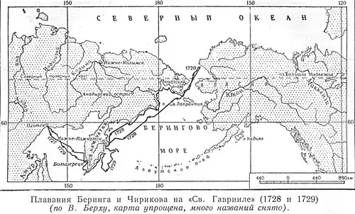 В 1729 Беринг сделал вторую попытку достичь американского берега, но через 3 дня после выхода в море, пройдя на восток 200 километров из-за сильного ветра и тумана повернул назад, обогнул Камчатку с юга, выявив Камчатский залив и Авачинскую губу, и через Охотск и всю Россию вернулся в Петербург.