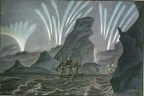 В полночь увидели к SW на горизонте небольшой свет, на зарю похожий и простирающийся почти на пять градусов; когда мы держали на юг, свет сей возвышался. Я полагал, что происходит от большой льдины; однако ж, когда начало рассветать, свет бледнел и при восхождении солнца на сем месте были белые весьма густые облака, а льду не видно. Подобного явления до сего времени мы не встречали.