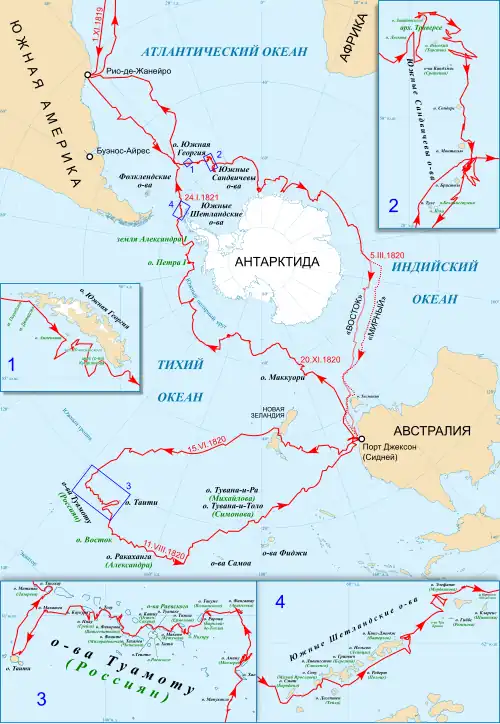 Русская антарктическая экспедиция завершилась полным успехом, став второй (после Джеймса Кука), которая обошла всю Антарктику. Из 751 дня экспедиции 527 были проведены под парусами; общая протяжённость маршрута составила 49 860 морских миль (86 475 вёрст)[2]. 127 дней экспедиция находилась в широтах выше 60° ю. ш.; к берегам Антарктиды команда подходила 9 раз, в том числе четырежды на расстояние 3—15 км. На карту Антарктики было нанесено 28 объектов, обнаружено и поименовано 29 островов в высоких южных широтах и тропиках[3][4].