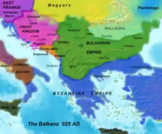 Во время правления князя Бориса I (852889) священнослужители из византийской фемы Фессалоники, братья Кирилл и Мефодий, создали славянский алфавит (863). В 865 году христианство объявили государственной религией болгар, впоследствии Бориса I канонизировали. В 867 году, воспользовавшись смутой в Византии, болгары захватили город Лихнид (др.-греч. Λυχνιδός, позднее Охрид)[24]. В 889 году Борис добровольно отрёкся от престола и ушёл в монастырь. Его сын и новый князь Владимир-Расате ненавидел христианство. Он разрушал храмы и церкви. В конце концов Борис вернулся, ослепил его и посадил на престол другого сына — Симеона. Борис вновь ушёл в монастырь
