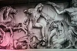 | «Битва Зевса с Порфирионом»: Зевс ведёт борьбу одновременно с тремя противниками. Поразив одного из них, он готовится метнуть свою молнию в предводителя врагов — змееголового исполина Порфириона. | ||