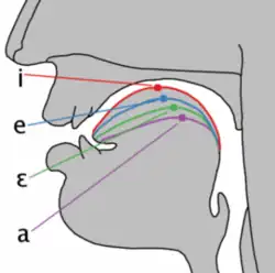 Определяющей характеристикой гласных переднего ряда является положение языка, который при произнесении находится как можно ближе к зубам, но без сужения, при котором звук был бы согласным.