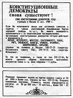 С принятием закона СССР от 09.10.1990 № 1708-1 «Об общественных объединениях», стала возможной официальная регистрация политических партий, первыми из которых были ДПР, СДПР и РПРФ зарегистрированные Минюстом РСФСР 14 марта 1991 года[39][40]. В рассматриваемый период происходило образование различных партий. Большинство партий действовали на территории одной союзной республики, что способствовало усилению сепаратизма союзных республик, включая РСФСР. В своём большинстве новообразованные партии находились в оппозиции к КПСС.