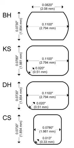 В 1916 году один из основателей фирмы «Белл-Хауэлл» Дональд Белл предложил использовать гибрид из круглой и прямоугольной перфорации[14]. Он представляет собой часть круга, ограниченную сверху и снизу прямыми отрезками. Перфорация такого типа имеет международное название BH (англ. Bell & Howell) или N (англ. Negative), по названию фирмы разработчика и основного производителя перфорационных машин, и применяется по сей день в негативных и контратипных плёнках[21][22][23]. В соответствии с рекомендацией ISO/R 491 такая перфорация получила обозначение «тип-3»[24]. В 1923 году крупнейший в мире поставщик киноплёнки Eastman Kodak в результате исследований пришёл к форме прямоугольника с закруглёнными углами. Высота такой перфорации, получившей обозначение KS (англ. Kodak Standard) или P (англ. Positive), была увеличена по сравнению с BH[25]. В современном стандарте ISO 491:2002 перфорация KS обозначается, как «тип-1»[24]. К 1925 году большинство сортов киноплёнки изготавливались с перфорацией Kodak, однако, негативная плёнка, подвергающаяся небольшому износу, продолжала изготавливаться с перфорацией Белла[26][19].
