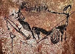- Под изображением человека и бизона — сложный зубчатый символ. Практически идентичные знаки можно найти и на других стенах, на остриях дротиков и на светильнике из песчаника, найденных неподалёку от этого места.