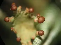 Для бесполого размножения лишайников характерно экзогенное формирование спор внутри пикнидий, заметных на поверхности таллома в виде мелких тёмных точек. В центре пикнидии имеется полость, которая иногда замещается системой сообщающихся сверху канальцев. Внутри полость может быть заполнена слизью, но почти всегда содержит отпавшие зрелые пикноконидии, выходящие из отверстия на вершине пикниды часто в виде слизистого шнура. Слизь обычно бесцветная, только у некоторых видов кладоний может иметь красноватый оттенок. В случае попадания внутрь пикнидия влаги слизь набухает и вместе с содержащимися в ней пикноконидиями выделяется через пору, после чего полость пикнидия зарастает плектенхимой.