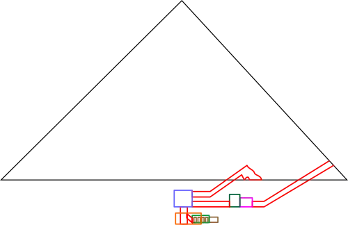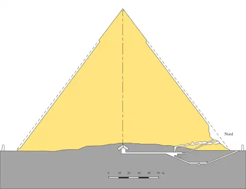 | 1. Главный вход 2. Вход, который проделал Аль-Мамун 3. Перекрёсток, «пробка» и туннель Аль-Мамуна, сделанный «в обход» 4. Нисходящий коридор 5. Незавершённая подземная камера 6. Восходящий коридор | 7. «Камера царицы» с исходящими «воздуховодами» 8. Горизонтальный туннель 9. Большая галерея 10. Камера фараона с «воздуховодами» 11. Предкамера 12. Грот |