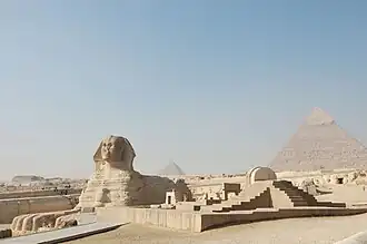 Большой Сфинкс расположен к востоку от пирамиды Хефрена. Статуя, которая была вытесана из единой глыбы того же материала, что и пирамиды Хеопса и Хефрена, представляет собой лежащего льва с головой человека. Её длина от передней лапы до хвоста составляет 57,3 метра, высота — 20 метров. На основании записи, найденной у ног статуи, предполагается, что Сфинкс был построен по приказу фараона Хафры, а черты его лица повторяют черты лица самого фараона. В настоящее время статуя сильно повреждена, особенно сильно досталось его лицу, испещрённому выбоинами[7].