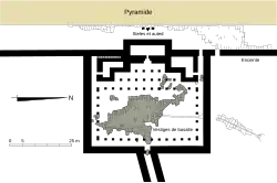 На основании расположения первого входа в пирамиду можно сделать вывод, что изначально длина основания составляла 60 метров, однако позже она была существенно увеличена. Погребальная камера первоначально располагалась в 6 метрах ниже основания, но позже была размещена ниже[6].