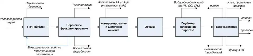 Современное производство этилена включает следующие узлы: непосредственно сам пиролиз, первичное фракционирование и разделение продуктов пиролиза, компримирование, осушка, глубокое охлаждение пирогаза и газоразделение.