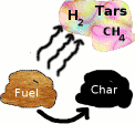 Этот процесс используется в пиролизных котлах. Процесс газификации древесины (пиролиз) происходит в верхней камере котла (загрузочном пространстве) под действием высокой температуры и при ограниченном доступе воздуха. Образующиеся при этом процессе газы проходят через зону высоких температур, достигают короба выходного устройства и смешиваются там со вторичным воздухом.