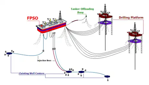 Нефть накапливается в плавучей установке для добычи, хранения и отгрузки нефти до тех пор, пока не накопится достаточного количества для наполнения нефтеналивного судна.