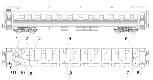 - Девять шестиместных пассажирских отделений (9-местных сидячих)