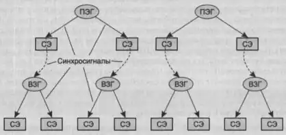 В случае небольшой сети ПЦИ , например сети города, синхронизация всех устройств сети из одной точки представляется достаточно простым делом. Однако для более крупных сетей, например, сетей масштаба страны, которые состоят из некоторого количества региональных сетей, синхронизация всех устройств сети представляет собой проблему. Общий подход к решению этой проблемы описан в стандарте ITU-T G.810 (1988, 1996 годы)[3][4]. Он заключается в организации в сети иерархии эталонных источников синхросигналов, а также системы распределения синхросигналов по всем узлам сети.