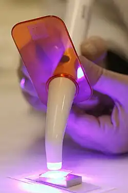 - Светополимерные композитные (световые, светоотверждаемые, гелиокомпозиты, фотополимеры) пломбы относятся к самым современным видам пломб. Они затвердевают (полимеризуются) только под действием специальной полимеризационной лампы видимого синего света с длиной волны 450—480 нм, что позволяет стоматологу максимально точно подогнать форму пломбы. Световые пломбы отличаются особой прочностью и широкой оттеночной гаммой. В их состав входит полимерный матрикс (часто бисфенол А-глицидил метакрилат (Бис-ГМА) — диэфир метакриловой кислоты и диглицидилового эфира бисфенола А), наполнитель (например, диоксид кремния, стеклокерамика) и связывающее вещество (например, силаны).
