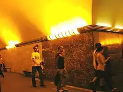 Карнизы расположены на высоте около двух метров, практически на уровне взгляда пассажиров. В 2006 году освещение станции было заменено с ртутных ламп на натриевые. С одной стороны станция стала выглядеть светлее, а с другой полностью поменялась цветовая палитра. По состоянию на лето 2007 года освещение было разноцветным: проходы между пилонами освещались белыми лампами, а станционные залы — жёлтыми. С 2021 года вся станция освещается белыми светодиодными лампами.